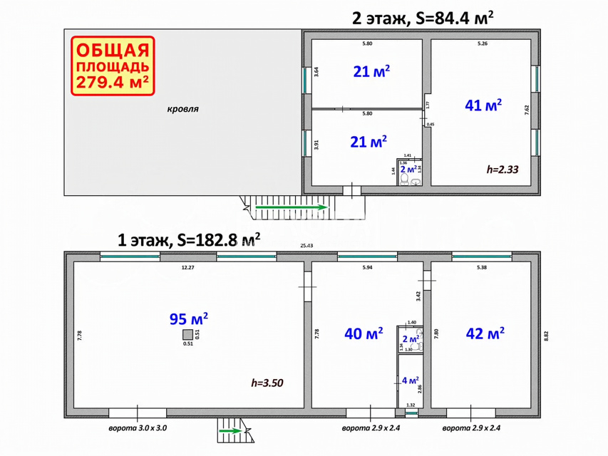 - Площадь: 279.4 кв.м. (первый этаж — рабочая зона, второй — офисная часть).
